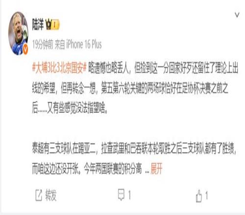而在北京国安惨遭绝平后,在前三轮仅仅拿到2分,继续排名小组倒数第一的同时,出线形势岌岌可危,对此,也是引来不少媒体人热议,其中,记者陆洋发文表示,北京国安略遗憾也略丢人,但捡到这一分回家好歹还留住了理论上出线的希望……
