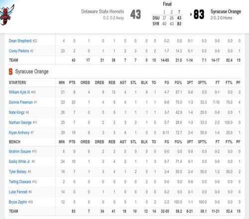 北京时间今日,在NCAA常规赛中,雪城大学以83-43击败了特拉华州立大学。